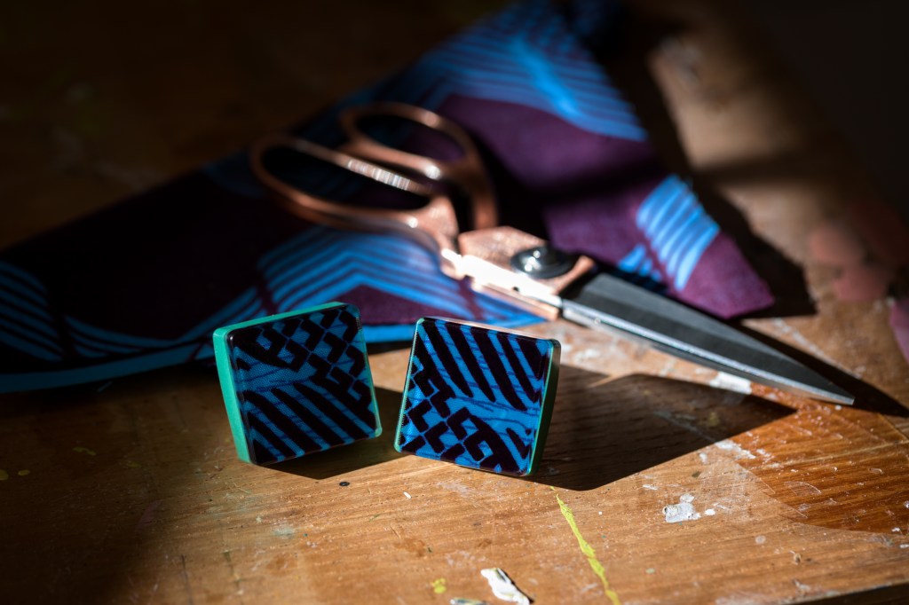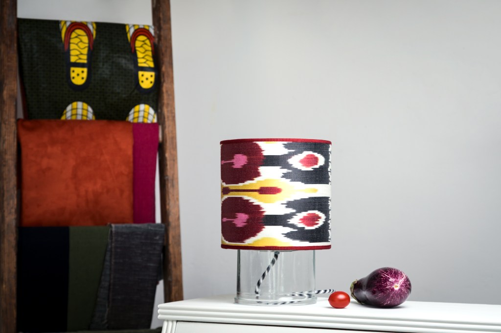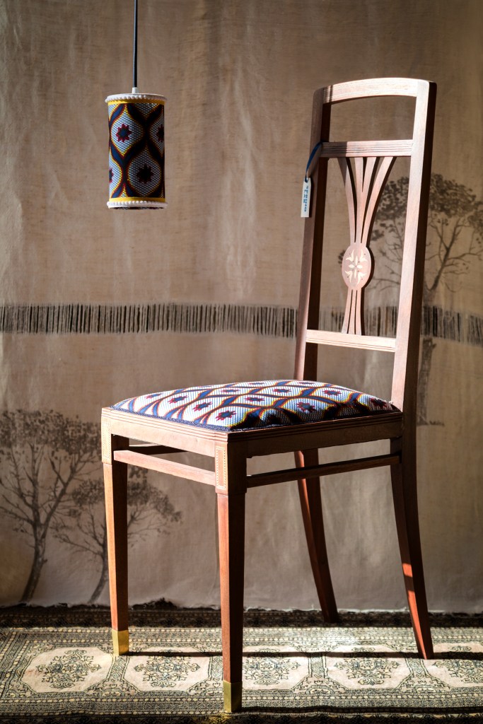 Ha molteplici funzioni: è sgabello, contenitore, punto d’appoggio. Un oggetto di design, un pezzo unico realizzato con materiale di recupero e tessuto wax dai colori esplosivi e geometrie affascinanti.