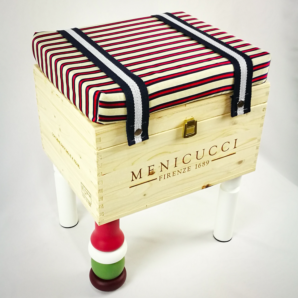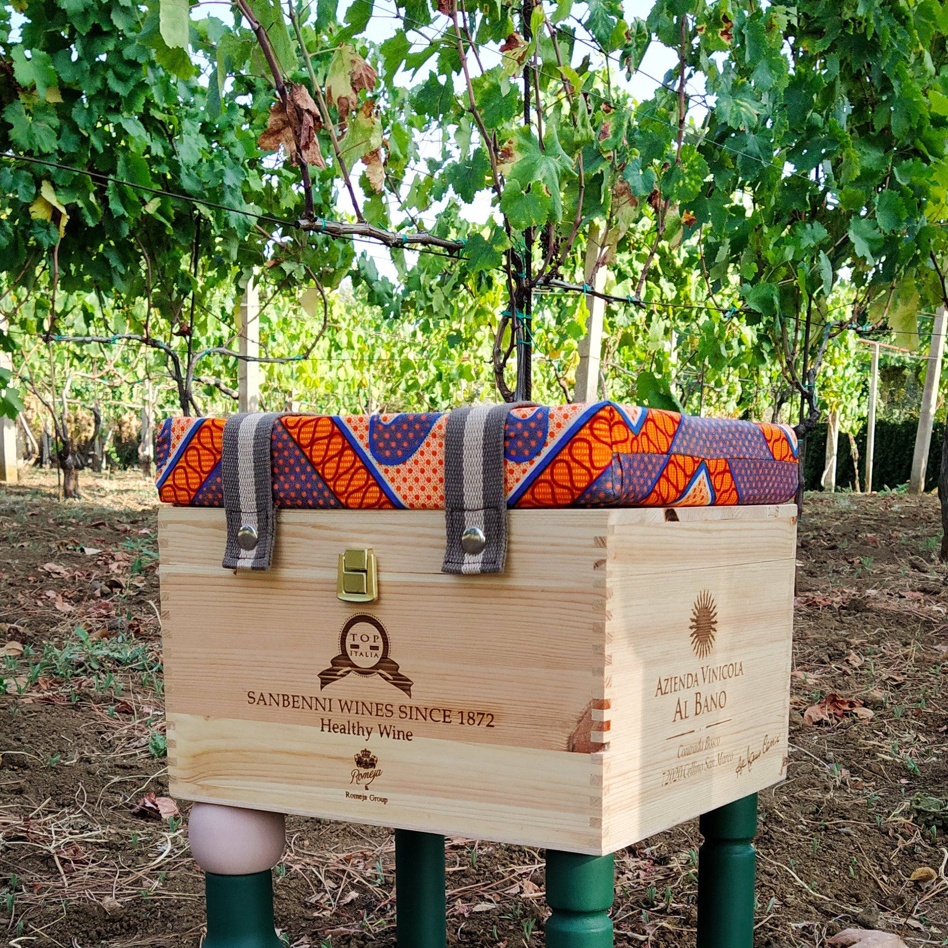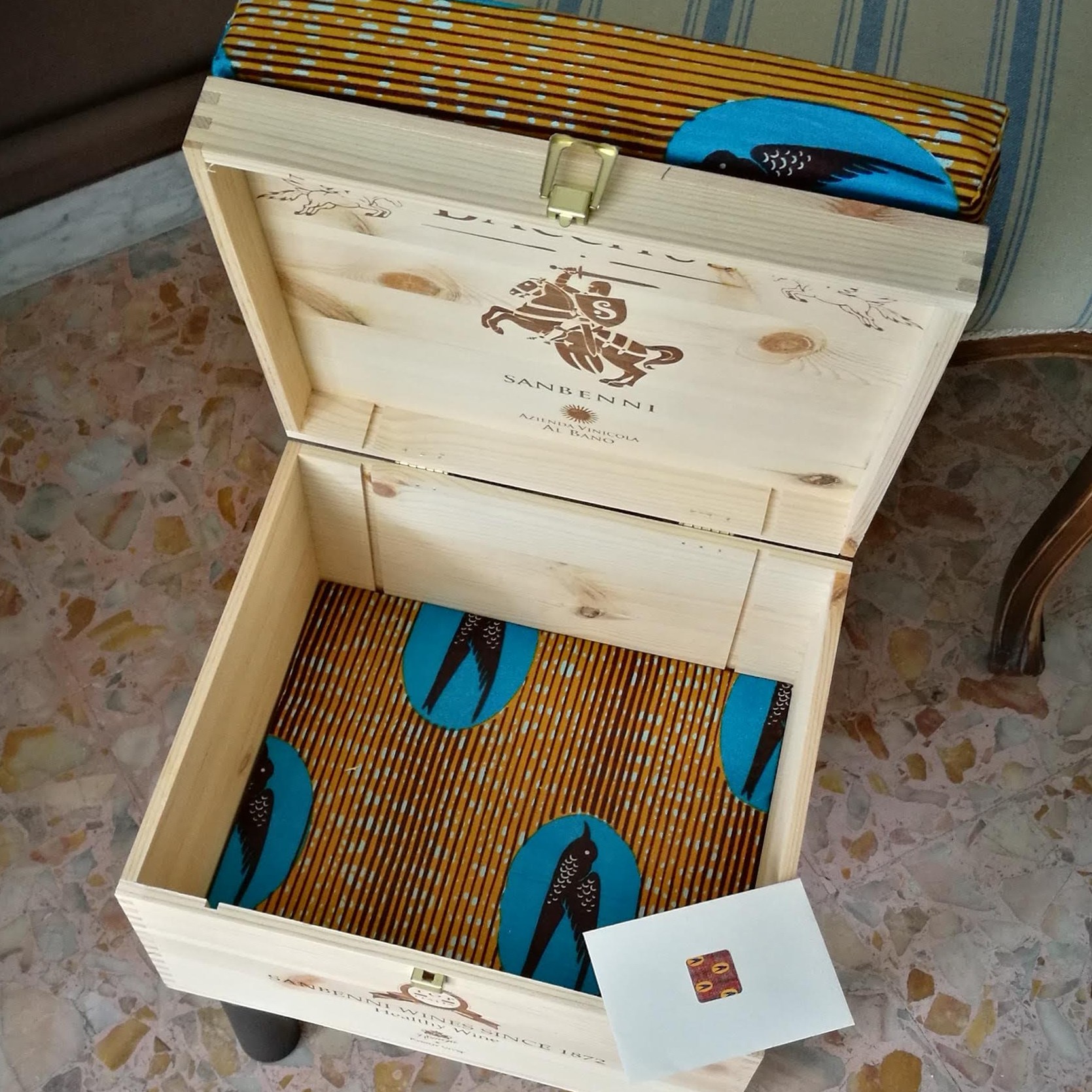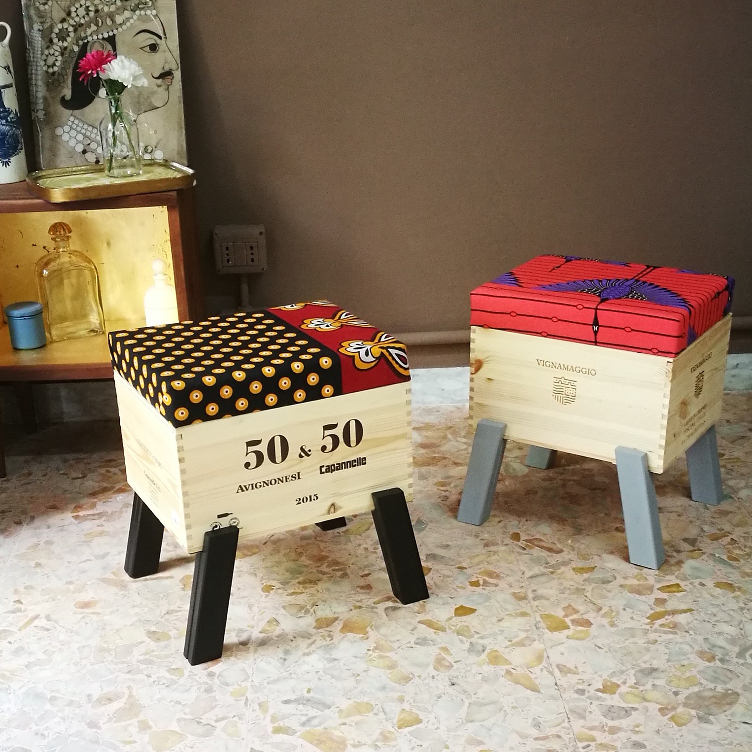Sono realizzate a mano riusando vecchie casse di bottiglie di vino. Sono munite di un comodo cuscino rivestito con tessuto wax, dai colori esplosivi e geometrie affascinanti. Le CasseDivine sono un oggetto di design: pezzi unici esteticamente validi e pienamente funzionali.