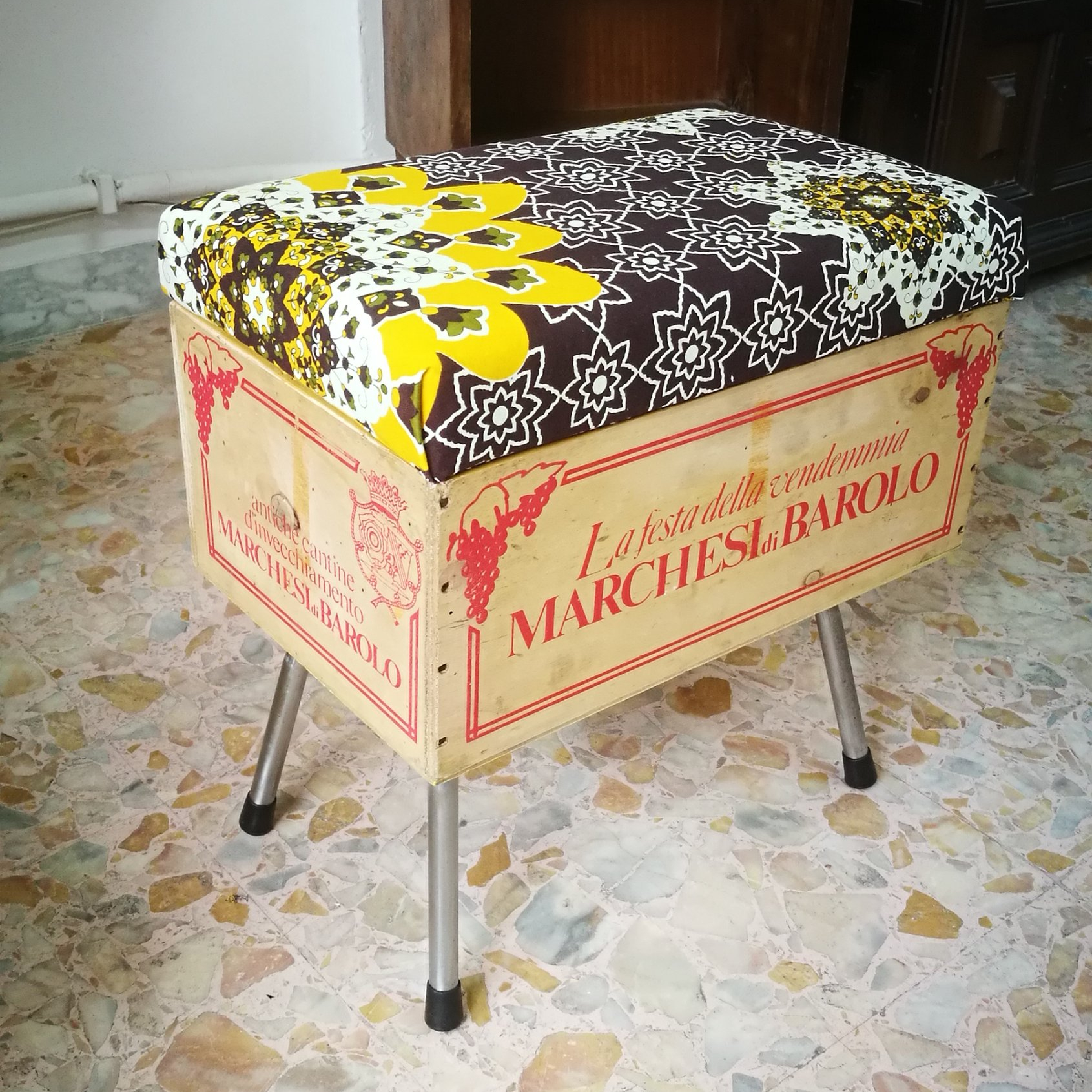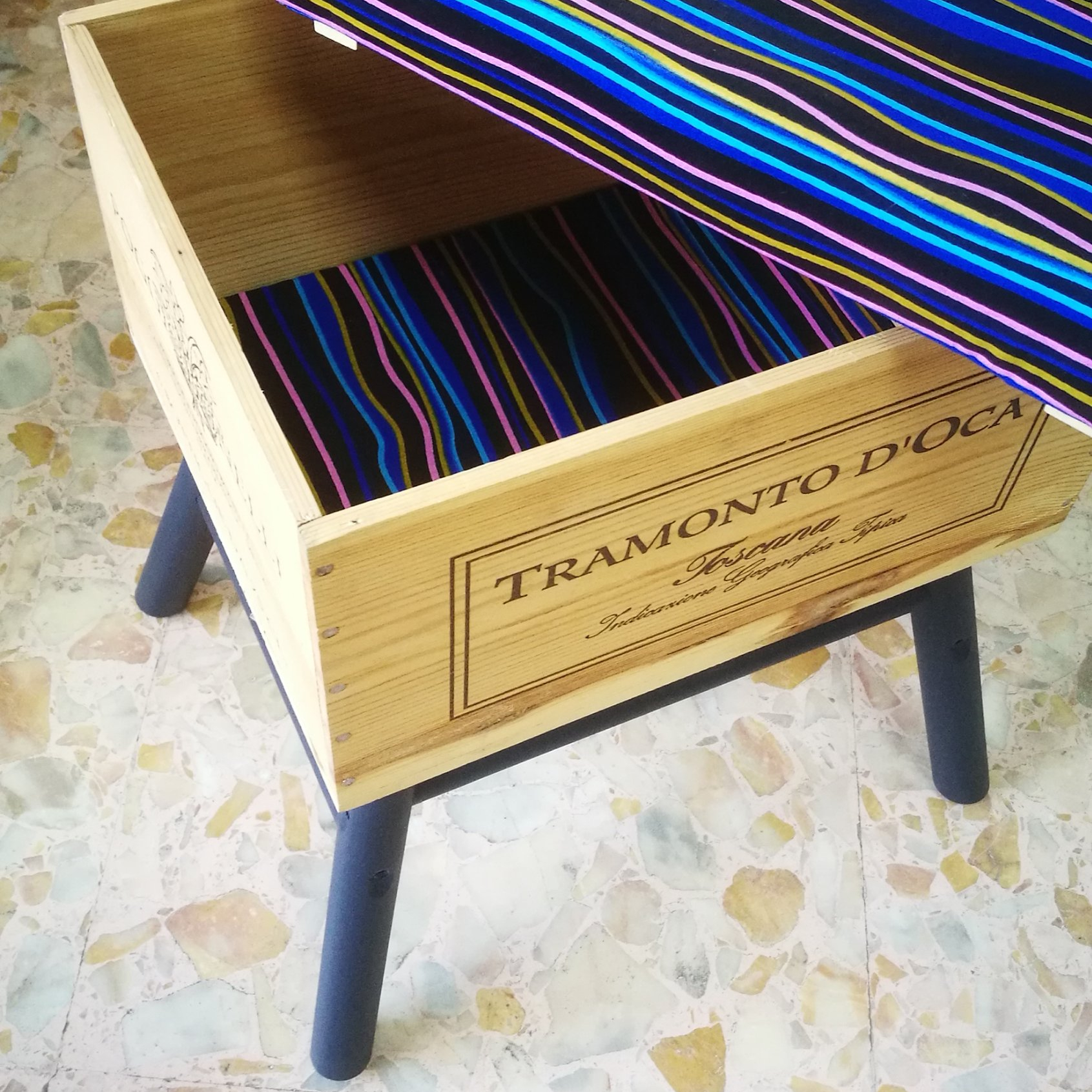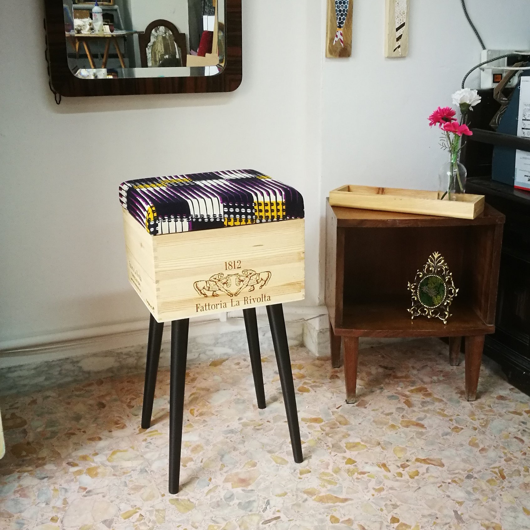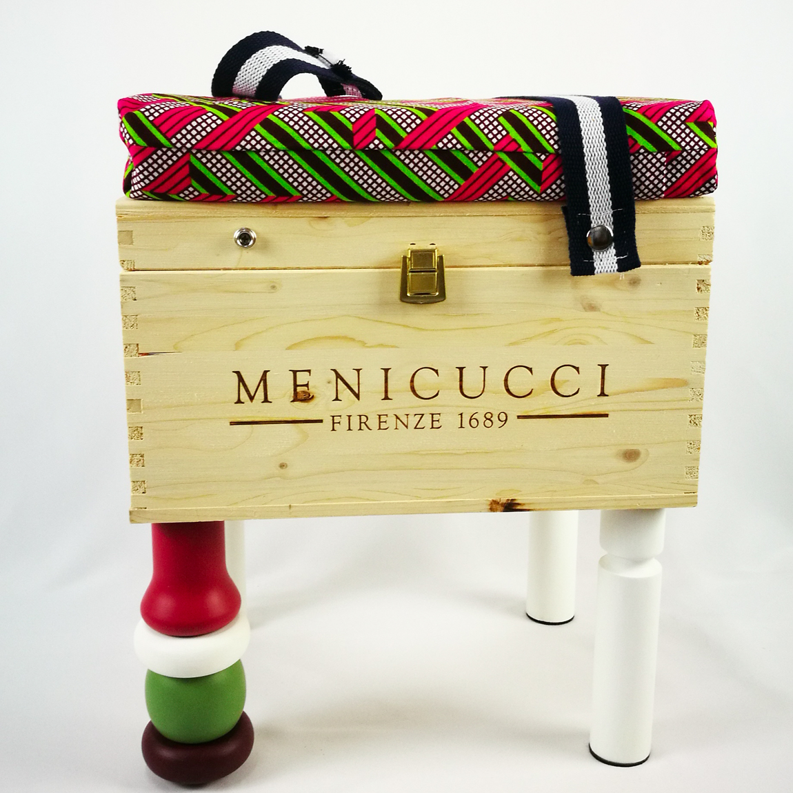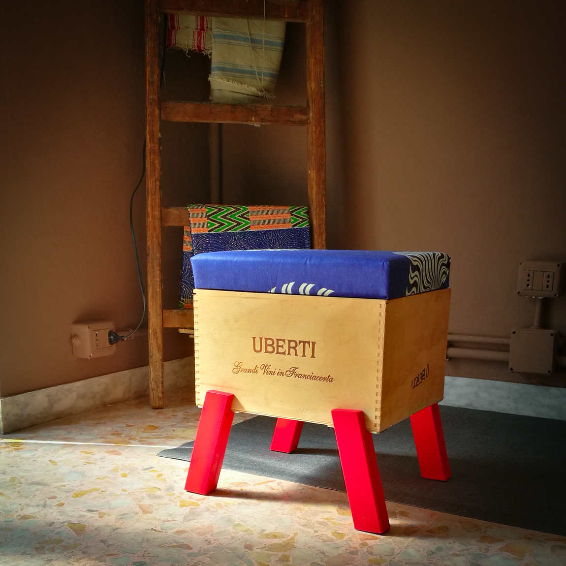 Sono realizzate a mano riusando vecchie casse di bottiglie di vino. Sono munite di un comodo cuscino rivestito con tessuto wax, dai colori esplosivi e geometrie affascinanti. Le CasseDivine sono un oggetto di design: pezzi unici esteticamente validi e pienamente funzionali.